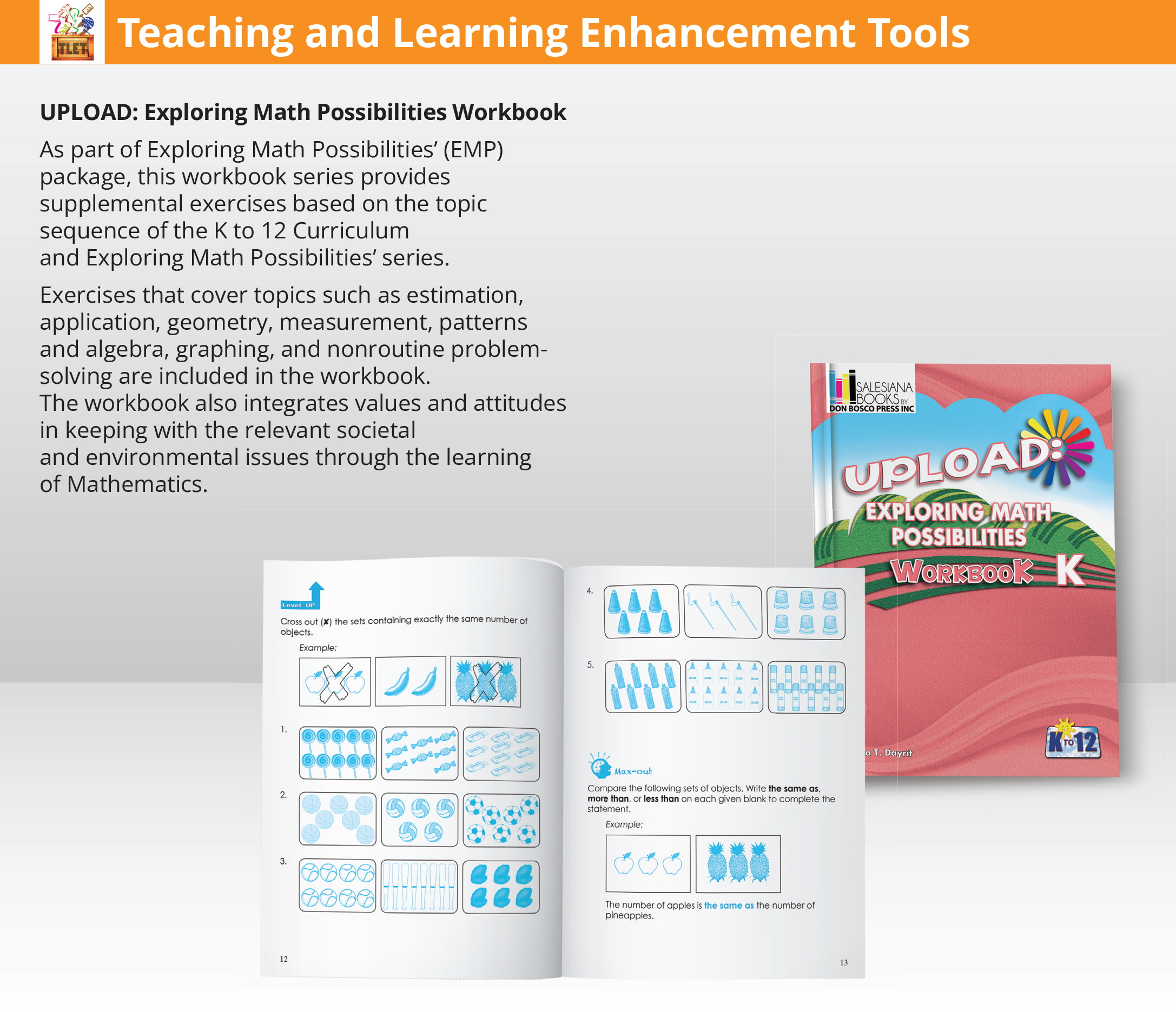 As part of Exploring Math Possibilities’ (EMP) package, this workbook series provides supplemental exercises based on the topic sequence of the K to 12 Curriculum and Exploring Math Possibilities’ series. Exercises that cover topics such as estimation, application, geometry, measurement, patterns and algebra, graphing, and nonroutine problemsolving are included in the workbook. The workbook also integrates values and attitudes in keeping with the relevant societal and environmental issues through the learning of Mathematics.