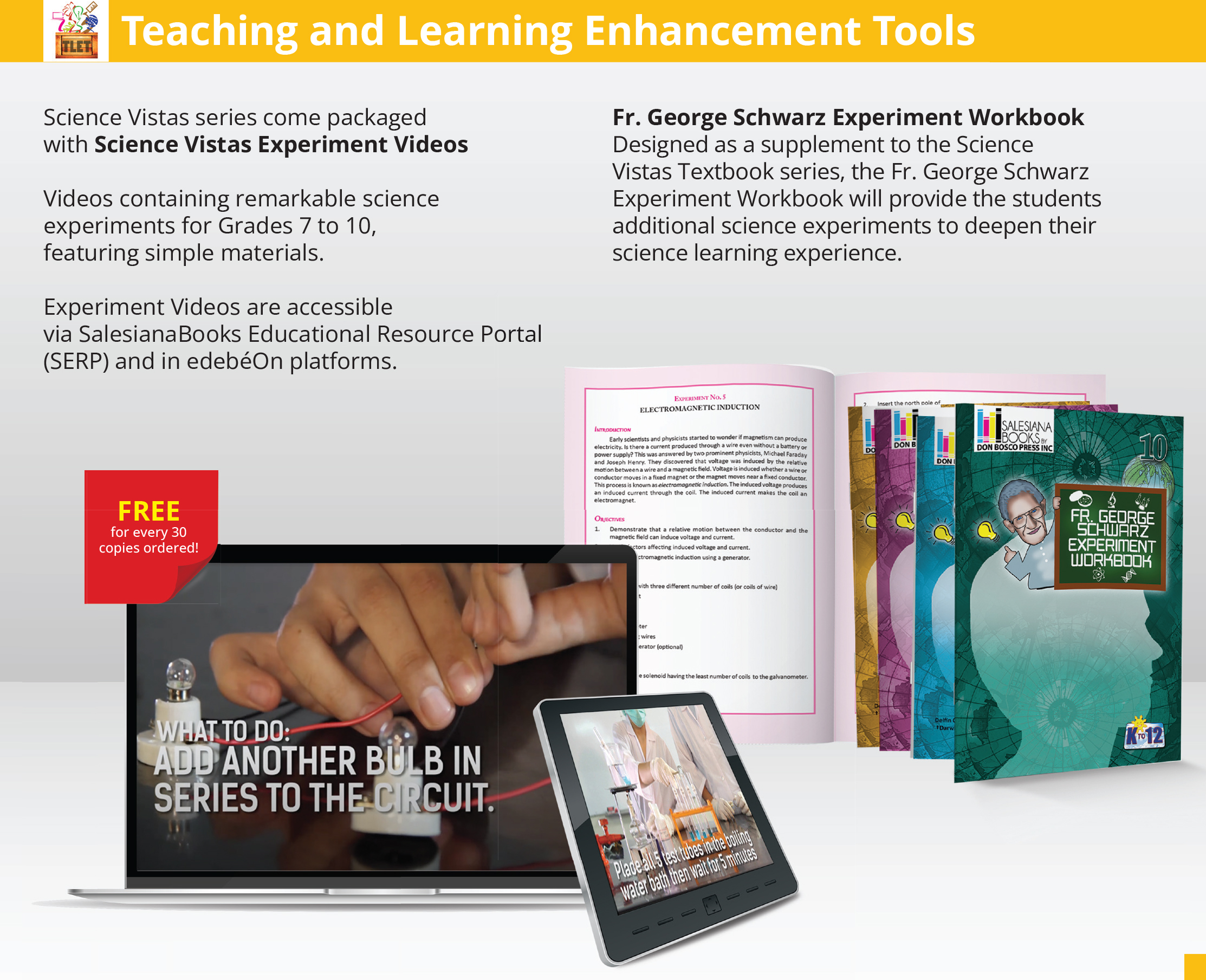 Videos containing remarkable science experiments for Grades 7 to 10, featuring simple materials. Experiment Videos are accessible via SalesianaBooks Educational Resource Portal (SERP) and in edebéOn platforms.