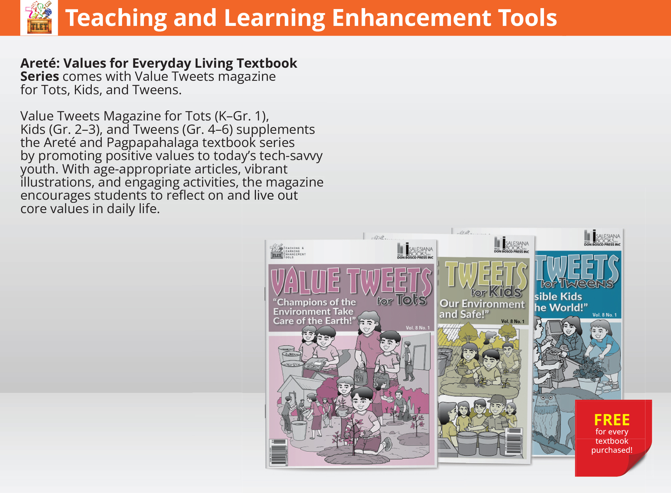 Value Tweets Magazine for Tots (K–Gr. 1), Kids (Gr. 2–3), and Tweens (Gr. 4–6) supplements the Areté and Pagpapahalaga textbook series by promoting positive values to today’s tech-savvy youth. With age-appropriate articles, vibrant illustrations, and engaging activities, the magazine encourages students to refl ect on and live out core values in daily life.