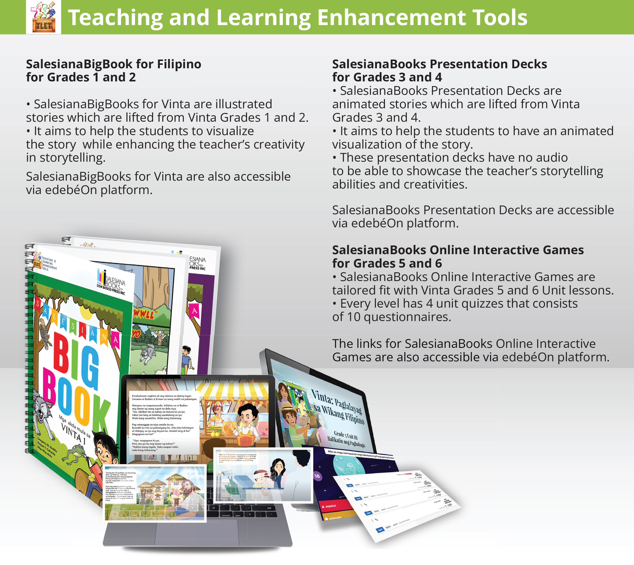 • It aims to help the students to visualize the story while enhancing the teacher’s creativity in storytelling. SalesianaBigBooks for Vinta are also accessible via edebéOn platform.
